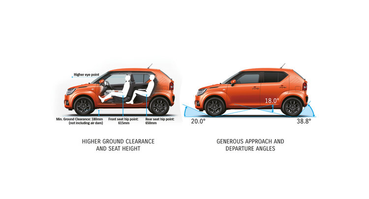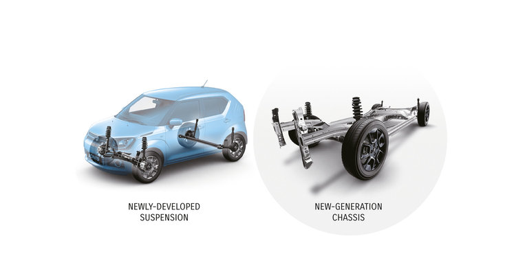 A new generation, stronger-but-lighter chassis provides a stable framework while reducing drag. A more rigid, yet lighter suspension smooths out shocks and enables more responsive and controlled handling, while large diameter tyres and a minimum turning radius of just 4.7m make Ignis easy to manoeuvre down narrow roads or in tight car parks.